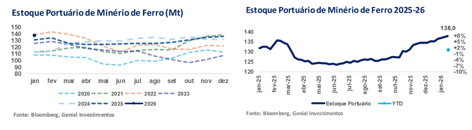 Nesse cenário macroeconômico, os fundamentos do aço e do minério de ferro permanecem fracos. O consumo de aço entrou na baixa temporada de inverno, com condições climáticas adversas restringindo as atividades de construção. Ao mesmo tempo, os estoques portuários de minério de ferro continuaram a aumentar, atingindo 138Mt (+1% s/s) em meados de jan/26 e ficando +14% vs. média dos últimos 6A, refletindo a resiliência das chegadas de cargas em contraste com a demanda anêmica de aço. Embora o aumento dos estoques seja em parte sazonal antes do Ano Novo Lunar (17-Fev), acreditamos que o ritmo de acumulação de estoques continua desalinhado com as condições atuais da demanda. Assim, do lado da oferta, embora as interrupções relacionadas ao clima possam desacelerar temporariamente os embarques de minério de ferro nos próximos meses (estação chuvosa no Brasil e na Austrália), o balanço de oferta vs. demanda geral permanece folgado.