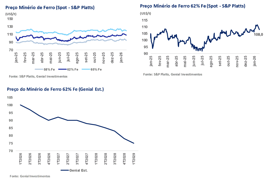 Nesse contexto, continuamos a considerar os preços do minério de ferro em torno de US$108-110/t (DCE) como mais sustentados por fatores sazonais e impulsionados pelo sentimento do que por fundamentos. (i) Estoques elevados; (ii) demanda fraca por aço; e (iii) oferta global ampla continuam a limitar a alta. Mantemos nossa opinião de que os preços em ~US$110/t são difíceis de sustentar com base apenas em fatores fundamentais e provavelmente não persistirão. Prevemos que os preços retomarão sua tendência de queda anterior até o final do 1T26, indo em direção a nossa média projetada de US$95/t 26E. Essa perspectiva é mais pessimista vs. consenso, que espera que os preços fiquem entre US$100-105/t este ano.