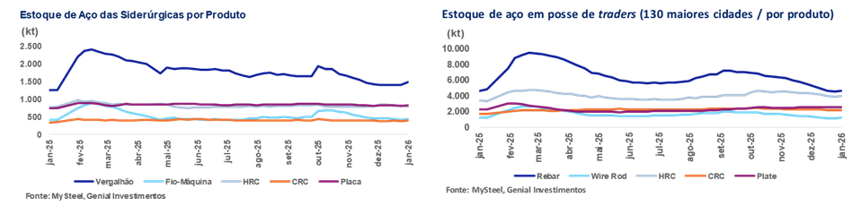 No nível da distribuição, os estoques aumentaram modestamente, marcando uma pausa no prolongado ciclo de redução visto em semanas anteriores. Os estoques mantidos por traders e centros de distribuição nas 132 cidades monitoradas aumentaram para 14,5Mt (+2% s/s), encerrando uma contração de 11-semanas. O aumento foi generalizado, com o vergalhão subindo para 4,7Mt (+2% s/s), o fio-máquina para 1,2Mt (+5% s/s), HRC para 4Mt (+3% s/s) e CRC para 2,2Mt (+1% s/s), enquanto os estoques de chapas grossas aumentaram para 2,6Mt (+2% s/s). No geral, acreditamos que a recuperação simultânea dos estoques das usinas e distribuidores sugere que a recente fase de liquidação está perdendo força, já que a produção supera a absorção sazonal da demanda. Embora os produtos longos continuem se beneficiando da melhora nas taxas operacionais, a calmaria da demanda no inverno e o retorno gradual da oferta apontam para uma dinâmica de estoques mais equilibrada — e potencialmente frágil — no curto prazo, especialmente para o aço plano.