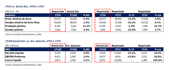(i) Produção de minério de ferro de 69,7Mt (+0,9% vs. Est.; -22,9% t/t; +3,0% a/a), refletindo restrições da estação chuvosa em todos os sistemas, com S11D (PA) estabelecendo um recorde no 1T em 19,8Mt e Capanema (MG) no cronograma para ramp-up completo no 2T26E; embarques de finos de 59,4Mt (+2,4% vs. Est.; -19,2% t/t; +4,7% a/a), com 5,5Mt de drawdown de estoques dos estoques em trânsito acumulados no 2S25; preço realizado em US$95,8/t (-0,3% vs. Est.; +0,5% t/t; +5,5% a/a), prêmio de finos se recuperando para US$4,1/t (+US$2,6/t t/t), com produtos de alto teor de sílica quase eliminados em 1,2% do mix; (ii) Produção de pelotas de 8,2Mt (+13,1% vs. Est.; -1,5% t/t; +13,7% a/a), com impacto de Omã contido via redirecionamento para Tubarão (ES), embora o reinício tenha sido adiado para o final do 3T26E; embarques em 7,7Mt; preço realizado em US$133,8/t (-1,5% vs. Est.; +1,8% t/t; -5,0% a/a), ainda pressionado por margens fracas das usinas e oferta da Samarco; (iii) Produção de níquel de 49Kt (+2,1% vs. Est.; +6,5% t/t; +12,3% a/a), com Voisey’s Bay (NL) e Onça Puma (PA) ambos estabelecendo recordes no 1T26; embarques em 45Kt, abaixo da produção com acúmulo de estoques antes da manutenção do 2T26E; preço realizado em US$17.015/t (+13,3% t/t; +5,6% a/a); (iv) Produção de cobre de 102Kt (+8,7% vs. Est.; -5,5% t/t; +12,5% a/a), com Sossego (PA) em 29,0Kt antes da parada programada de 110 dias do moinho SAG no 2S26; embarques em 91Kt; preço realizado em US$13.143/t (+3,8% vs. Est.; +19,4% t/t; +47,8% a/a); (v) Receita líquida de US$9,4b Est. (-15,2% t/t; +15,5% a/a); (vi) C1/t ex. terceiros em US$23,8/t Est. (+12,0% t/t; +13,5% a/a), refletindo obstáculo cambial, carryover do CPP e arrasto da Aliança; (vii) EBITDA Proforma de US$4,1b Est. (-15,8% t/t; +26,8% a/a); (viii) No entanto, gostaríamos de enfatizar que, embora haja volatilidade no preço das ações, isso nos parece uma questão macro relacionada à realocação de fundos passivos, e não uma mudança ativa nos fundamentos ou do equity story da companhia. Portanto, reiteramos nossa recomendação de MANTER, com Target Price 12M deUS$17,00 ADR (NYSE) e R$90,00 VALE3 (B3), implicando um upside de apenas +3,4%.