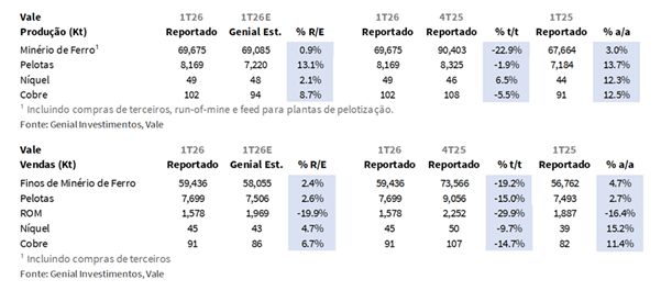 A Vale divulgou seu Relatório de Produção e Vendas do 1T26 ontem,16/abril, após o fechamento do mercado. Acreditamos que os destaques positivos vão para (i) as operações da VBM, onde tanto o cobre quanto o níquel entregaram números que superaram as estimativas de produção e preço, e (ii) os embarques de finos de minério de ferro, que vieram acima da nossa estimativa (59,4Mt; +2,4% vs. Est.; +1,3% vs. Consenso BBG), sustentados por uma desestocagem maior do que a esperada. No lado financeiro, essas supresas operacionais contribuem para uma revisão para cima em nosso EBITDA Proforma para US$4,1b Est. (+2,6% vs. Est. anterior; -15,8% t/t; +26,8% a/a). Os resultados financeiros serão divulgados em 28/abr, também após o fechamento do mercado.