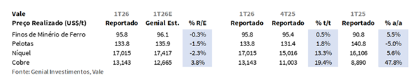 Adicionalmente, os resultados operacionais do 1T26 refletiram (i) produção de minério de ferro limitada pela estação chuvosa, embora os embarques de finos tenham vindo acima das estimativas devido a um drawdown de estoques maior do que o esperado, (ii) pelotas impactadas pela manutenção em Omã, com o redirecionamento do feed para Tubarão (ES) contendo o impacto de forma mais eficaz do que o assumido, e (iii) VBM entregando beats tanto em cobre quanto em níquel, impulsionados por um avanço acentuado nos preços realizados liderado pelo LME. No balanço geral, o relatório operacional foi melhor do que o previsto, contribuindo para uma revisão para cima em nosso EBITDA Proforma (+2,6% vs. Est. anterior), mas também insuficiente para alterar nossa narrativa por ora.