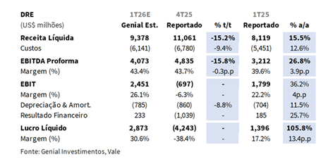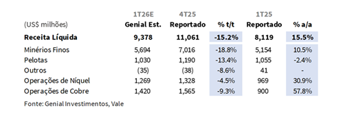 Projetamos a Receita Líquida consolidada registrando US$9,4b Genial Est. (-15,2% t/t; +15,5% a/a), refletindo a acentuada queda sazonal nos volumes ferrosos em relação ao 4T25, apenas parcialmente compensada pela força contínua da VBM. Chamamos atenção para o desempenho do cobre, onde o avanço do LME entregou um preço realizado materialmente mais forte. Em base sequencial, o recuo é impulsionado principalmente pelo minério de ferro finos, onde a receita deve se comprimir para US$5,7b Est. (-18,8% t/t; +10,5% a/a), refletindo a combinação de (i) menores embarques sazonais (-19,2% t/t) e apenas (ii) um leve aumento no preço realizado (+0,5% t/t). As pelotas também contribuem negativamente em US$1,0b Est. (-13,4% t/t; -2,4% a/a), pressionadas por menores volumes, apesar de uma modesta recuperação de preços t/t.