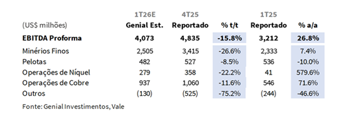 O EBITDA Proforma consolidado deve totalizar US$4,1b Genial Est. (-15,8% t/t; +26,8% a/a), refletindo a acentuada queda sazonal nos volumes ferrosos em relação ao 4T25 juntamente com custos unitários mais elevados, apenas parcialmente compensados pela força da VBM, particularmente o robusto ambiente de precificação do cobre. Em base sequencial, o recuo deve ser liderado pelo minério de ferro finos, que apesar de permanecer o maior contribuidor de EBITDA em termos absolutos, deve se comprimir para US$2,5b Est. (-26,6% t/t; +7,4% a/a), impulsionado por menores embarques sazonais e pela base mais alta do C1/t. Nosso modelo aponta para a contribuição de Pelotas em US$482m Est. (-8,5% t/t; -10,0% a/a), com a lucratividade permanecendo limitada pela economia de prêmios ainda deprimida vs. níveis históricos, embora tenha melhorado levemente t/t.