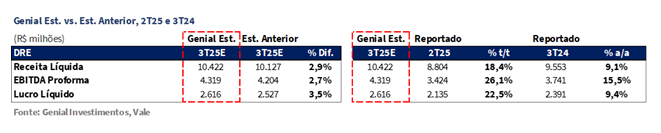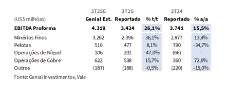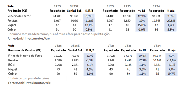 A Vale divulgou seu Relatório de Produção e Vendas do 3T25 ontem, 21 de Out., após o fechamento do mercado. Os números operacionais vieram, em sua maioria, levemente acima das nossas estimativas contribuindo para um incremento de EBITDA Proforma para US$4,3b Genial Est. (+2,7% vs. Est. Antiga; +26,0% t/t; +15,5% a/a). O resultado financeiro será divulgado no dia 30 de Out., também após o fechamento do mercado.