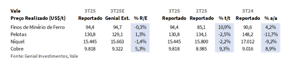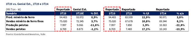 A produção de minério de ferro totalizou 94,4Mt (+0,5% vs. Genial Est.), avançando +12,9% t/t e +3,8% a/a, em linha com o nosso cenário de continuidade do momentum observado no 2T25. O desempenho positivo foi impulsionado pela combinação da sazonalidade mais favorável diante do período mais seco do ano, com avanços de ramp-ups e melhor eficiência operacional. O Sistema Norte foi puxado pelo (i) nível de excelência em S11D (PA), que alcançou sua maior produção histórica para um 3T, atingindo 23,6Mt (+7% a/a), como reflexo direto das melhorias contínuas em desempenho e confiabilidade dos ativos, compensando integralmente o recuo observado em Serra Norte para 26,2Mt (-5% a/a). Ainda que a produção em esteja em depletion, avaliamos que esse efeito é parcialmente mitigado pelo novo plano de lavra, com a criação do mid-grade Carajás (~63% Fe).