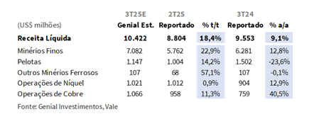 A Receita líquida consolidada deve totalizar US$10,4b Genial Est. (+18,4% t/t; +9,1% a/a), ligeiramente acima da nossa projeção anterior, impulsionada pela contribuição positiva, de volume de venda de finos (+4% vs. Genial Est.). A alta sequencial deve refletir todos os segmentos, com influência majoritária da divisão de ferrosos, em virtude da forte aceleração dos embarques de finos de minério de ferro (+10,8% t/t), com efeito adicional da recuperação do preço realizado (+10,9% t/t), combinadas com um nível decente de embarques em pelotas (+17,2% t/t), apoiada pela sazonalidade típica. Já na comparação anual, o avanço deve ser explicado pela maior contribuição de finos de minério de ferros e metais básicos.