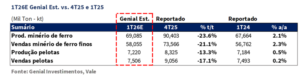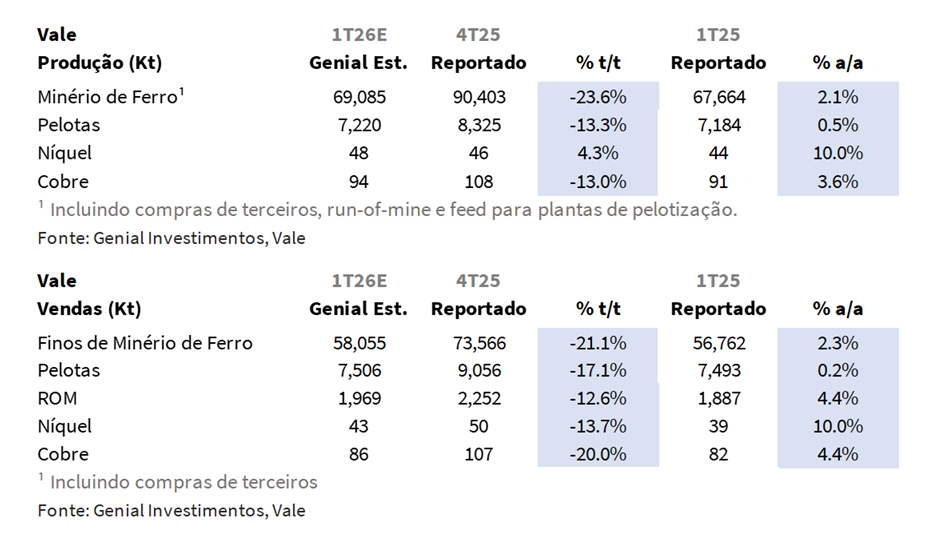 VALE3 Prévia Operacional 1T26: Produção e Vendas