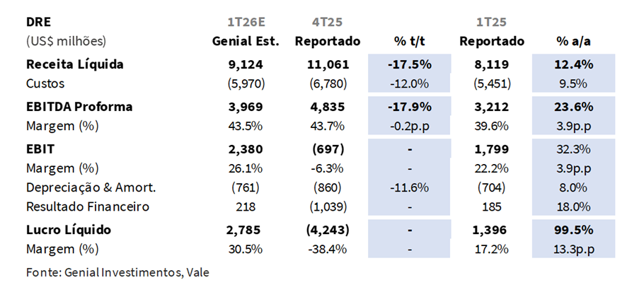 Como resultado, projetamos Receita Líquida consolidada de US$9,1b Est. (-17,5% t/t; +12,4% a/a), impulsionada por preços realizados mais elevados na VBM e sustentada tanto por vendas quanto por preços mais firmes de minério de ferro finos, parcialmente compensados por preços de pelotas mais baixos. No lado dos custos, projetamos C1/t ex-terceiros em US$23,8/t Est. (+12,0% t/t; +13,5% a/a), refletindo o efeito combinado de (i) apreciação da taxa de câmbio USD/BRL, (ii) carryover do CPP (custo de produção) do 4T25 e (iii) o arrasto da desconsolidação da Aliança Energia. Consequentemente, o EBITDA Proforma é projetado em US$4,0b Est. (-17,9% t/t; +23,6% a/a), com margens em 43,5% (-0,2p.p. t/t; +3,9p.p. a/a). Por fim, estimamos um Lucro Líquido de US$2,8b Est. (+99,6% a/a). Esses números permanecem provisórios e serão atualizados após o Relatório de Produção e Vendas da Vale em 16/abr., após o fechamento do mercado. O resultado financeiro será divulgado em 28/abr., também após o fechamento do mercado.