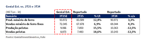 Projetamos que a produção de minério de ferro totalize 93,9Mt Genial Est. (+12,4% t/t; +3,3% a/a), refletindo a continuidade do momentum operacional no Sistema Sudeste, após o start-up da 4° linha Brucutu (MG) e ramp-up em Capanema (MG) — ativos que, combinados, adicionaram +3Mt a/a no 2T25 (esperamos algo similar no 3T25E). Além disso, acreditamos que no Sistema Norte, a performance será comandada por S11D (PA) e a sequência do plano de lavra mais eficiente em Serra Norte (PA), alinhado ao novo direcionamento estratégico de mix (Mid-grade Carajás ~63% Fe). Projetamos que os embarques de finos de minério de ferro atinjam 72,3Mt Genial Est. (+6,9% t/t; +4,3% a/a), acompanhando de perto a evolução da produção e com gap ligeiramente menor entre produção e vendas a/a.