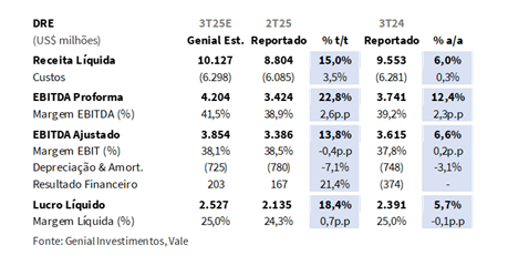 Com isso, projetamos Receita Líquida consolidada de US$10,1b Genial Est. (+15,0% t/t; +6,0% a/a); C1/t ex-terceiros deve recuar para US$21,0/t (-5,5% t/t; +1,7% a/a), sequencialmente refletindo maior diluição de custos ajudando na contração de gastos, mas com efeito atenuado pela suavização da taxa de câmbio USD/BRL (-4% t/t). Ressaltamos que um aumento de +R$0,10 na taxa USD/BRL, o C1/t cai -US$0,25/t, e a recíproca é verdadeira. Assim, o EBITDA Proforma está estimado em US$4,2b (+22,8% t/t; +12,4% a/a), com margem de 41,5% (+2,6p.p. t/t; +2,3p.p. a/a), enquanto o Lucro Líquido está em US$2,5b (+18,4% t/t; +5,7% a/a). Lembramos que esses números são provisórios, uma vez que iremos atualizar as estimativas assim que a Vale reportar o relatório de Produção e Vendas. O resultado financeiro será divulgado apenas no dia 30 de Out.