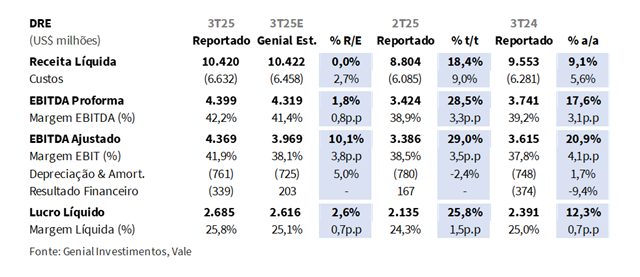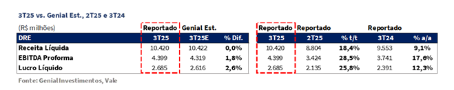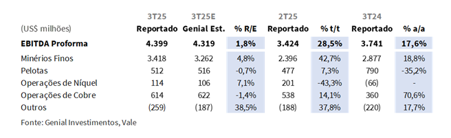 A Vale divulgou seu resultado do 3T25 ontem, dia 30 de Out., após fechamento de mercado. O EBITDA Proforma atingiu US$4,4b, subindo forte em +28,5% t/t e +17,6% a/a, vindo praticamente em linha com o esperado por nós (+1,8% vs. Genial Est.) e levemente acima do mercado (+4% vs. consenso). Salientamos que a ação da companhia vive um bom momento, com (i) claridade na conjuntura macro pelo recém-divulgado acordo entre EUA-China (mais sobre isso ao final do relatório) e (ii) curva 62% Fe em um patamar bem mais alto de preço (US$107/t no spot) vs. o que projetávamos no início do ano para o 2S25 (média de ~US$90/t Est. anterior).