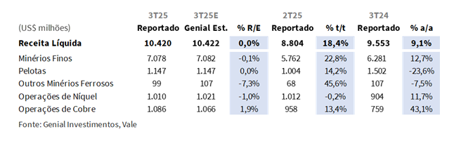 A Receita líquida consolidada totalizou US$10,4b (flat vs. Genial Est.), avançando +18,4% t/t e +9,1% a/a, sustentada pelo desempenho de finos de minério de ferro, cuja receita cresceu +22,8% t/t e +12,7% a/a, refletindo aumento de volumes e preços realizados mais fortes. A produção atingiu 94,4Mt (+0,5% vs. Est.), beneficiada pela sazonalidade favorável e pelo avanço operacional em S11D (PA) e Capanema (MG). Já os embarques de finos somaram 75Mt (+3,7% vs. Est.), com estreitamento do gap produção/venda para 79,5% (+2,5p.p. vs. Est.), impulsionado pela melhor conversão logística e pelo escoamento de cargas concentradas nos portos chineses.