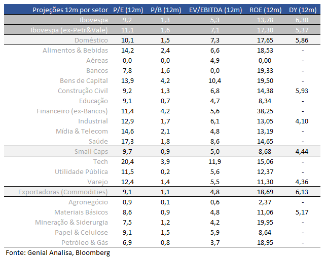 O Ibovespa está sendo negociado a 9,2 vezes o lucro projetado; abaixo da média histórica de 10,6 vezes. Excluindo Petrobras e Vale; índice sobe para 11,1 vezes; ainda mais barato que média de 12 vezes. Exportadoras aparecem a 9,1 vezes; bem distantes de sua média de 11,2 vezes. Small Caps estão a 9,7 vezes; bastante descontadas em relação à média de 13,8 vezes.
