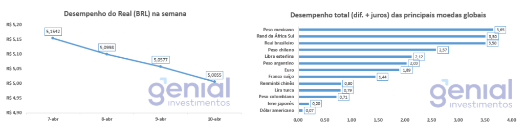 O real foi um dos protagonistas do rally emergente da semana. A moeda começou o período na casa dos R$ 5,15, sob tensão pelo conflito, e atravessou uma valorização contínua até encostar em R$ 5,00 no fechamento de sexta-feira, caminhando para o menor nível de fechamento em praticamente dois anos.