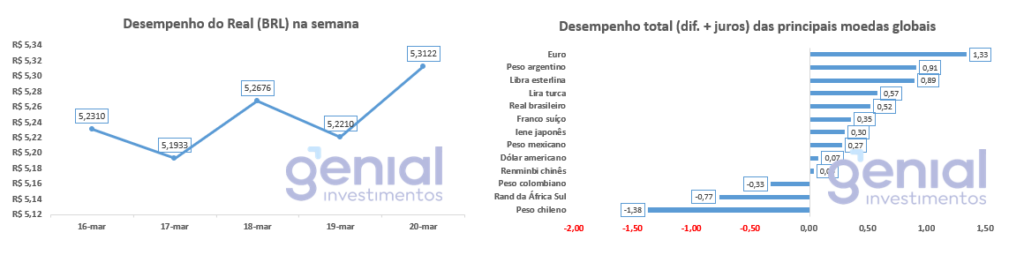 O real oscilou entre R$ 5,19 na segunda-feira e R$ 5,31 na sexta-feira, em semana de volatilidade acentuada ditada pelo petróleo e pela aversão a risco global. O Banco Central realizou operação casada de venda de dólar à vista com compra de swap reverso, provendo liquidez sem alterar sua exposição cambial líquida.