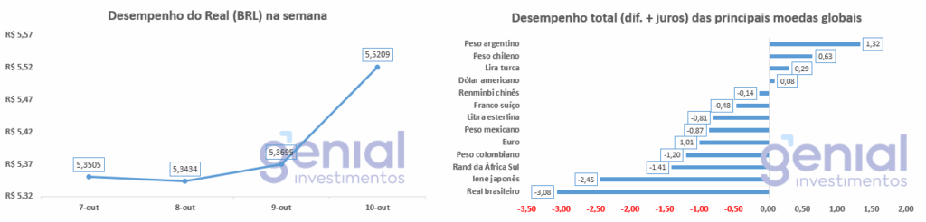 No exterior, o ambiente também pesou. A alta nos juros de longo prazo em economias centrais, impulsionada pelo quadro fiscal fragilizado na França e no Japão, somou-se à paralisação do governo dos EUA, que limitou a divulgação de dados econômicos. A sexta-feira foi especialmente negativa após declarações de Trump sobre possíveis tarifas pesadas contra a China, o que intensificou o movimento global de aversão ao risco. O resultado foi uma pressão combinada sobre o câmbio, os juros futuros e a Bolsa brasileira.
