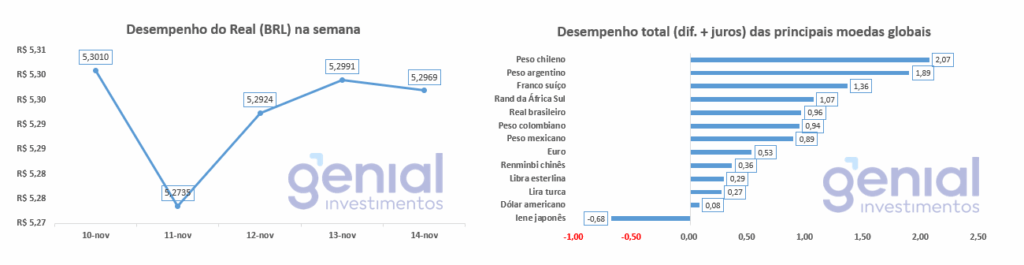 A moeda brasileira esteve entre as melhores performances globais em retorno total, somando a valorização cambial ao diferencial de juros, perdendo apenas para algumas moedas da América Latina e da Europa Oriental.
