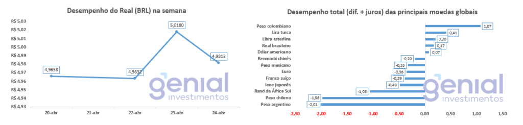 O real entrou na semana operando abaixo dos R$ 5,00, alinhado a pares latino-americanos como o peso mexicano e o peso colombiano, mas perdeu sustentação ao longo do período. A combinação de petróleo em forte alta, saída de estrangeiros da bolsa e disparada da curva de juros levou o câmbio a romper a barreira psicológica e fechar a semana acima desse nível.