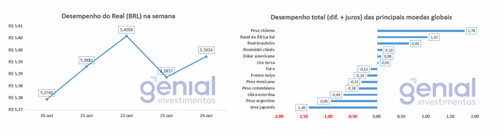 No campo político, o presidente Lula declarou intenção de disputar um quarto mandato, durante visita à Indonésia, alimentando o debate sobre gastos públicos e o cenário eleitoral de 2026. Já Trump adotou novas sanções contra petroleiras russas, o que afetou o mercado de energia e gerou impacto nas moedas globais. Ao mesmo tempo, o possível anúncio de uma reunião com a China no fim do mês trouxe especulações sobre um acordo diplomático em construção.