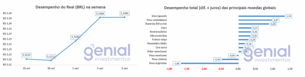 Esse contexto gerou um descolamento entre os ativos brasileiros e o exterior. Enquanto o Ibovespa teve desempenho ficou próximo da estabilidade, bolsas internacionais avançaram, sustentadas por fatores externos. A queda expressiva do petróleo, diante da expectativa de aumento de oferta pela OPEP+, impactou ações do setor de óleo e gás. Já o shutdown nos EUA trouxe ruídos pontuais, mas não afetou a direção dos mercados globais. O real oscilou frente a outras moedas emergentes, alternando entre valorização no início da semana e perda de força nos últimos pregões.