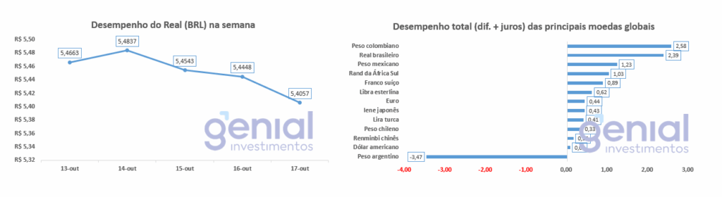 No entanto, sinais de deterioração nos bancos regionais dos EUA, com problemas de crédito em nichos específicos, ampliaram a cautela global. O Ibovespa subiu mais de 3% na semana, mas o movimento foi atribuído principalmente a ajustes técnicos, sem indicação clara de melhora nos fundamentos. A saída de investidores estrangeiros continuou, se aproximando dos R$ 7 bilhões apenas em outubro, enquanto a curva de juros brasileira seguiu pressionada nos prazos longos, refletindo maior exigência de prêmio de risco para o país no horizonte de longo prazo.