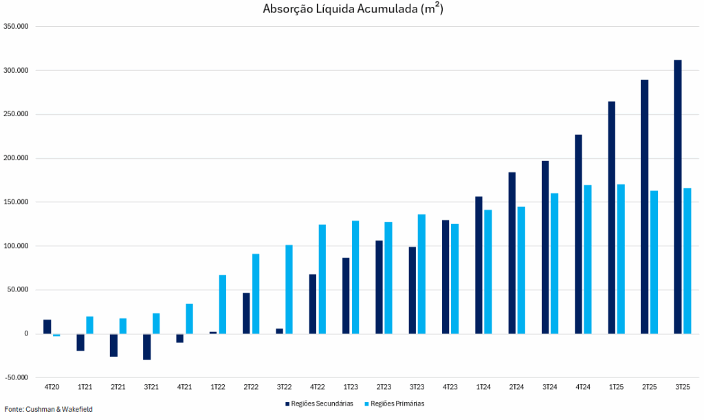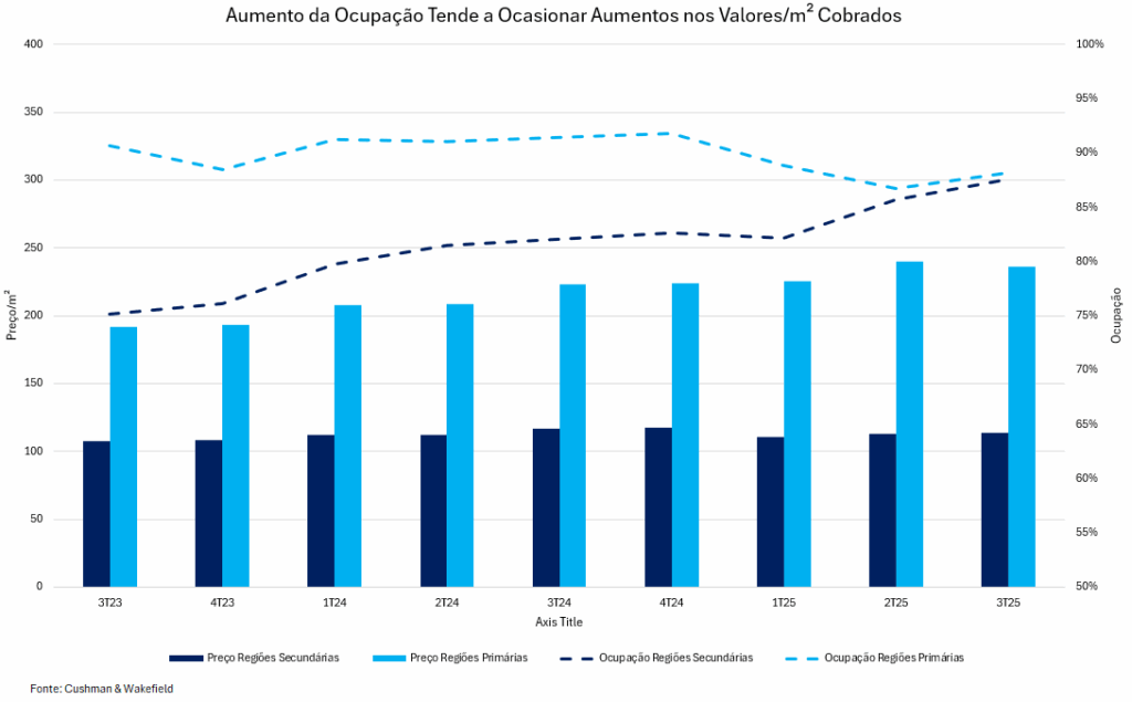A nosso ver, essas regiões ainda contam com uma dinâmica estrutural mais favorável, tanto no que diz respeito à recomposição do preço de locação por metro quadrado e da vacância. Enquanto isso, áreas como a Faria Lima, embora mantenham o status de referência em qualidade e preços, já operam em níveis historicamente elevados, o que limita avanços reais adicionais e torna mais desafiadora a absorção de novos espaços nos patamares atuais.