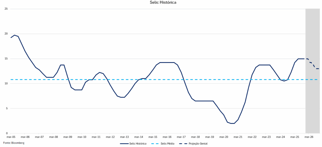 Mesmo considerando as projeções de redução da Selic no próximo ano – 12% segundo o Boletim Focus e 13% segundo a estimativa da Genial para o final de 2026 -, os juros ainda permaneceriam em níveis bastante elevados, inclusive acima da média observada nos últimos 20 anos. Além disso, como existe a possibilidade de um aumento na inflação para 2026, um movimento desse tipo poderia pressionar o Banco Central a promover novos ajustes altistas na taxa de juros. Esse cenário, por sua vez, teria potencial para gerar valorização adicional nos fundos dessa classe.