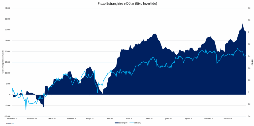 Nossa leitura atual é de um início de ano mais favorável, considerando uma maior propensão de cortes de juros nos EUA, enquanto no Brasil ainda observamos maiores pressões inflacionárias que por sua vez podem vir a reduzir o ciclo de corte de juros inicialmente previsto. Esse diferencial de juros é positivo para os mercados emergentes, dado que proporciona maior entrada de capital estrangeiro, queda nas taxas de câmbio e consequentemente em alguns componentes da inflação (em linha com o que já observamos ao longo do ano).