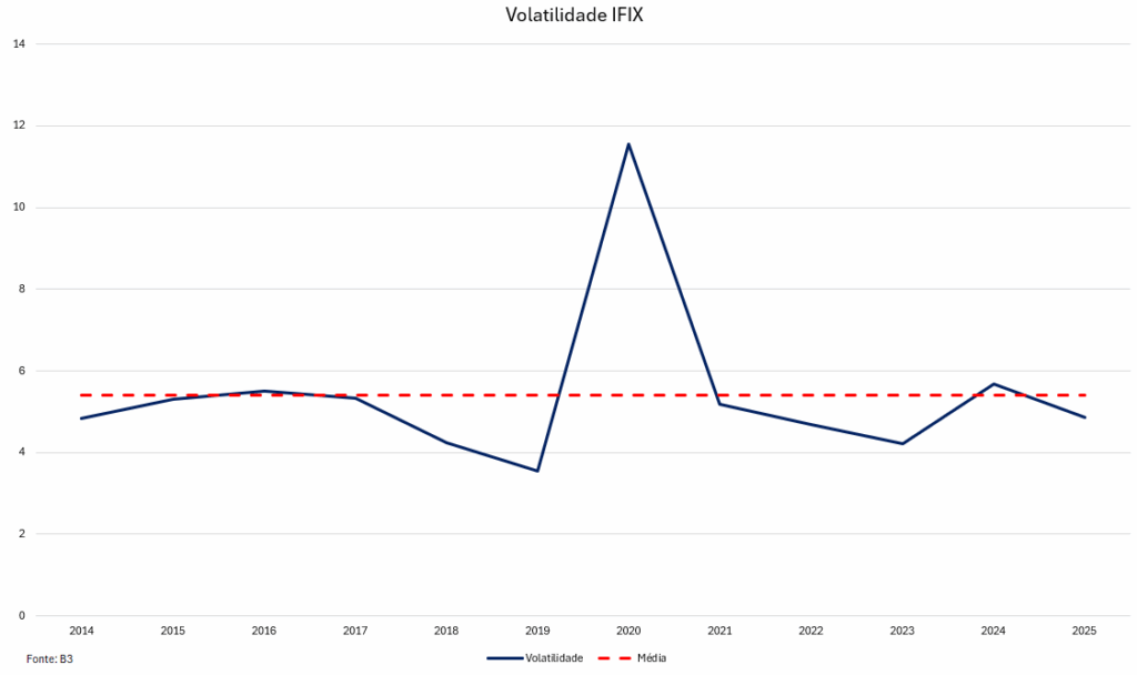 Embora o acumulado de 2025 até então apresente um resultado positivo, o comportamento do mercado ao longo do ano surpreendeu em termos de volatilidade, dado que esperávamos um ambiente consideravelmente mais desafiador para os fundos imobiliários. Ao analisarmos a volatilidade do índice em uma janela iniciada em 2014, observamos que 2025 se mostrou relativamente estável até então, sobretudo quando comparado ao nível de volatilidade que antecipávamos no final de 2024, refletindo principalmente as incertezas fiscais daquele período.