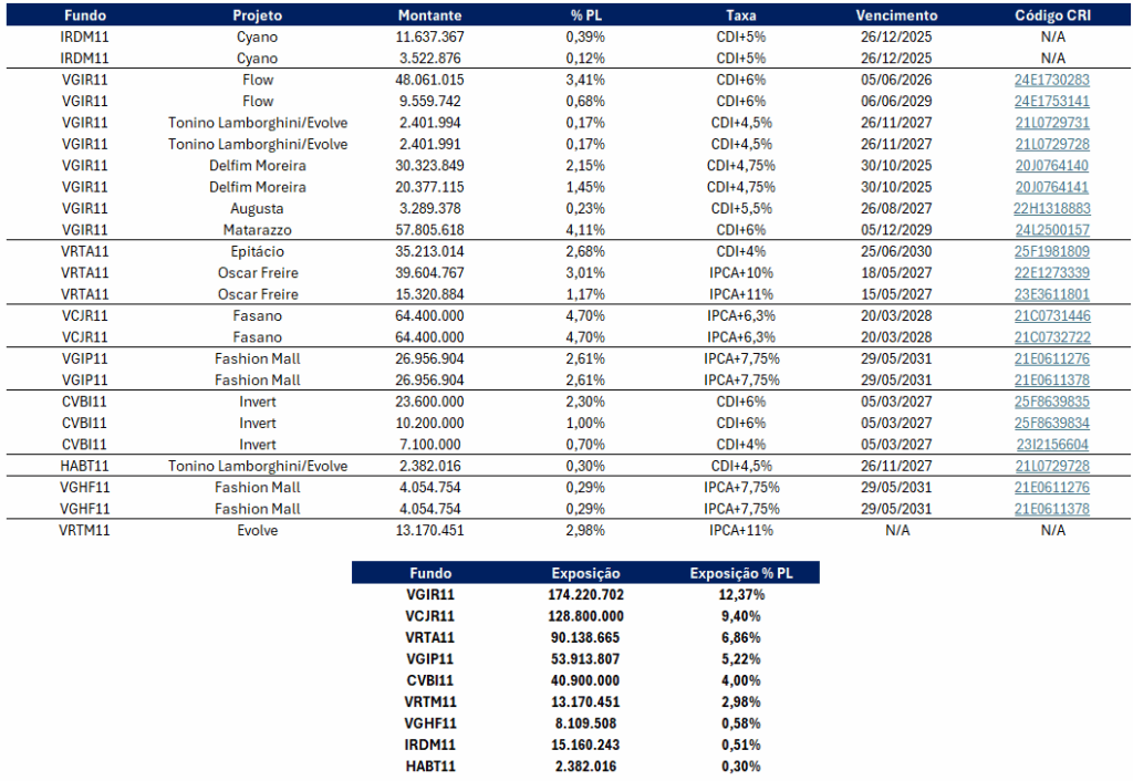 Nos casos de VCJR11, VGIP11 e VGHF11, embora exista exposição à Gafisa, destacamos que esses fundos estão lastreados em CRIs com estruturas de garantias mais robustas, incluindo alienações fiduciárias sobre imóveis já concluídos. Essa característica os diferencia de outros casos em que as garantias estão vinculadas a projetos ainda em construção, o que implica um risco maior, uma vez que, mesmo em caso de execução, o credor teria de arcar com custos remanescentes da obra e enfrentaria maiores dificuldades para vender um empreendimento em atraso.