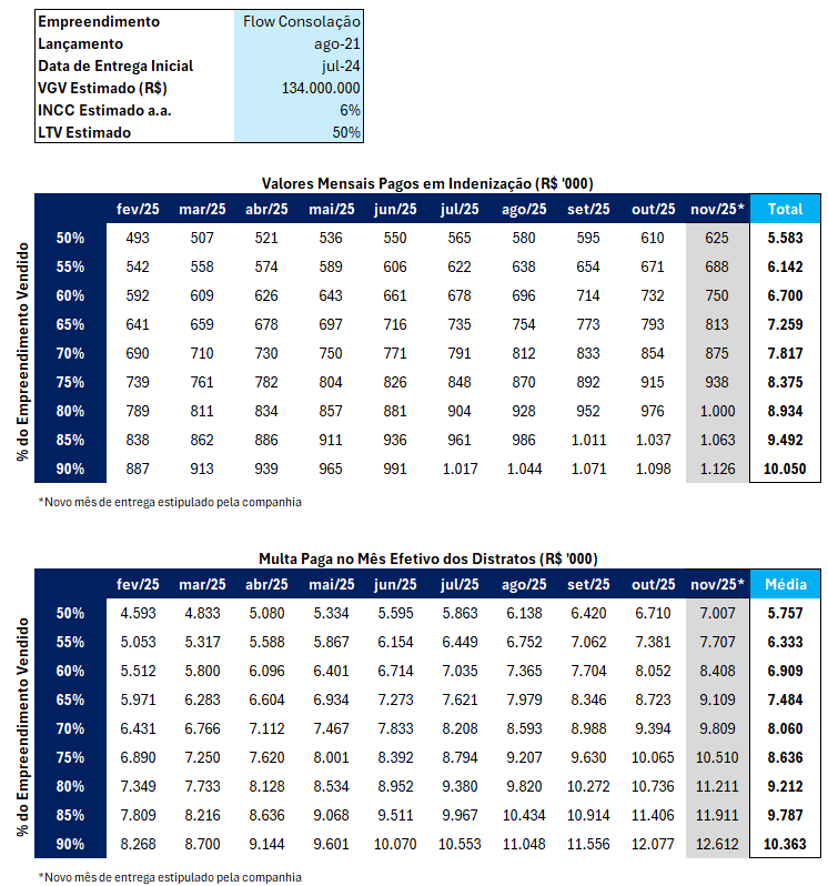 A partir desse exercício, buscamos dimensionar o potencial passivo da companhia em diferentes hipóteses, avaliando o impacto financeiro caso parte relevante dos compradores opte pela rescisão ou pela cobrança de indenizações. Tal análise permite não apenas estimar a pressão adicional sobre o caixa da Gafisa, mas também evidenciar os riscos de prolongamento da crise operacional da companhia em um contexto de crédito restrito e maior escrutínio do mercado.