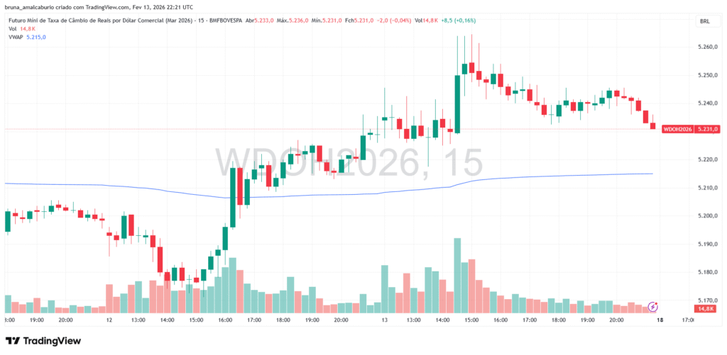 O dólar futuro mantém estrutura de curto prazo ainda construtiva após reação compradora no intraday, porém começa a perder inclinação na faixa de resistência, com candles de corpo menor e lateralização acima da VWAP. O fechamento dentro do range do dia indica equilíbrio entre fluxo comprador e realização, sugerindo continuidade do movimento lateral enquanto não houver rompimento consistente da máxima diária. No gráfico de 15min mostra mercado sustentado acima das bases recentes, mas dependente de fluxo para retomar tendência.