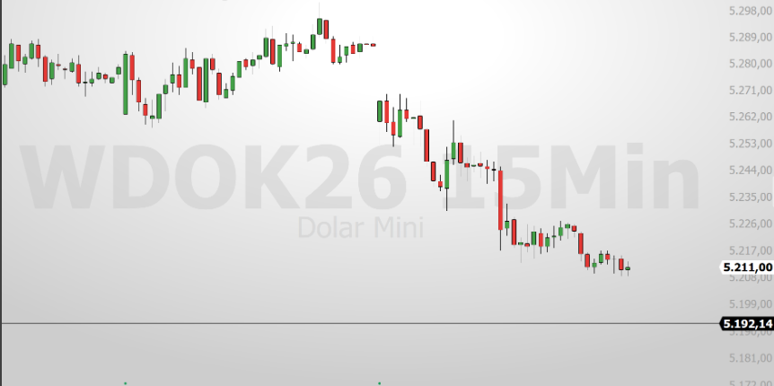 O dólar mini apresentou rejeição na região de máxima diária e desenvolveu forte movimento direcional de baixa, com fechamento próximo da mínima, caracterizando domínio vendedor no diário. A perda das regiões intermediárias de preço reforça mudança de controle do fluxo. No gráfico de 15 minutos, observa-se estrutura clara de topos e fundos descendentes, com consolidações curtas e continuidade, indicando tendência bem definida no intraday. Enquanto o preço permanecer abaixo das resistências imediatas, o viés segue baixista, com potencial de extensão do movimento em direção aos suportes inferiores, especialmente se houver perda consistente da mínima do dia.definição direcional mais clara.