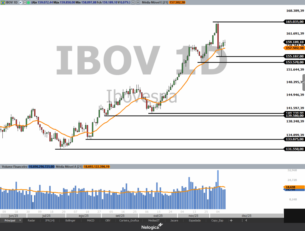 O Ibovespa fechou próximo da estabilidade (+0,07%) aos 159.189 pontos e permanece acima da MME21 (média móvel exponencial de 21 períodos) que funciona como suporte imediato em 157.500 pontos. Enquanto respeitar essa MME21 a tendência de alta no curto prazo deve continuar. A próxima resistência e máxima histórica fica em 165.035 pontos deixada no pregão de 05 de dezembro. Já os próximos suportes ficam em 157.500 (MME21), 153.570 e 140.230 pontos.