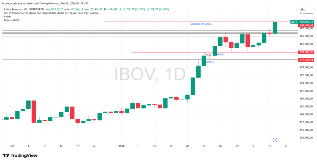 O IBOV rompe máxima histórica com candle de força e fechamento próximo da máxima do dia, confirmando continuidade do movimento direcional comprador e expansão de tendência. A estrutura segue claramente altista, com topos e fundos ascendentes e fluxo sustentando o índice acima da antiga zona de congestão entre 185k–187k, agora convertida em suporte. Enquanto permanecer acima dessa faixa, o viés segue de continuidade, com probabilidade de busca por extensões do movimento; perda desse patamar passa a sinalizar correção técnica mais ampla após o breakout.