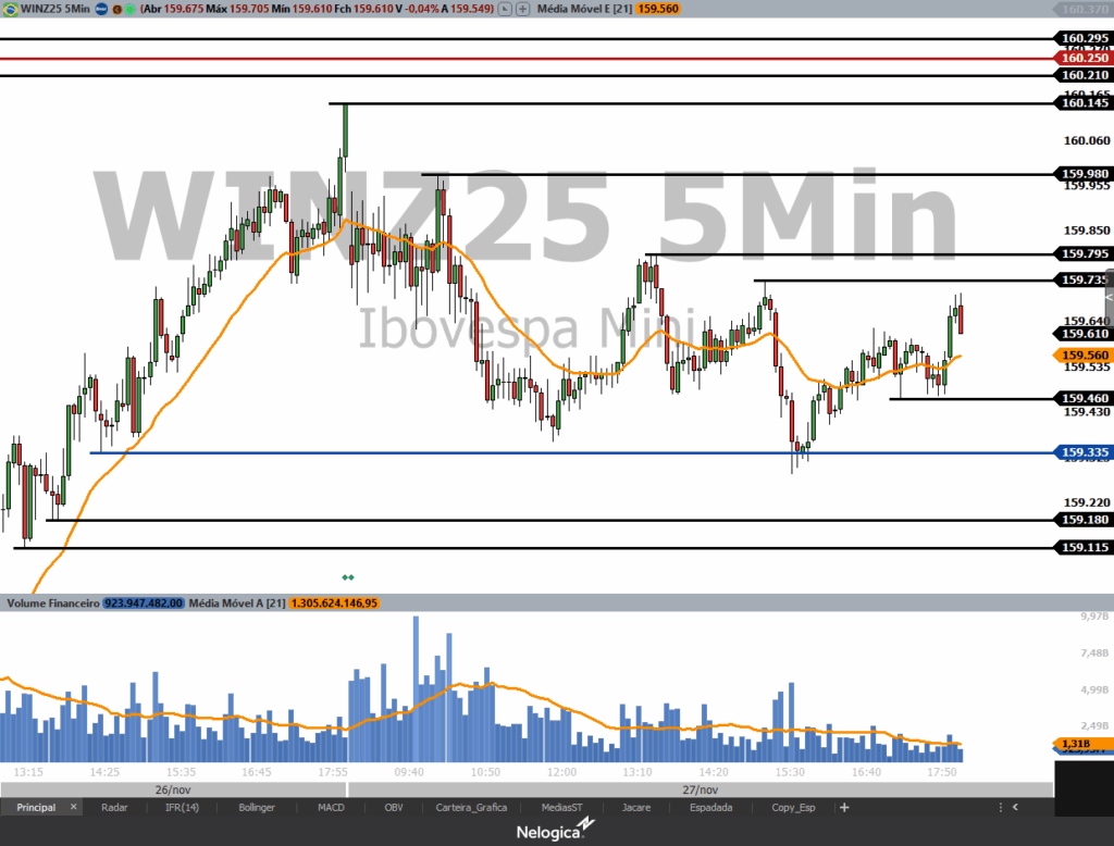 O WINZ25 fechou em baixa de 0,33% aos 159.610 pontos. Os próximos suportes ficam em 159.460, 159.335 (muito forte), 159.180, 159.115 e 158.475 pontos. Já as próximas resistências ficam em 159.735, 159.795, 159.980 e 160.145 pontos.