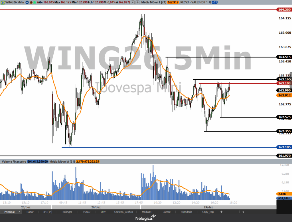 O WING26 fechou em baixa de 0,65% aos 162.990 pontos muito próximo da resistência imediata e muito forte que fica em 163.100 pontos. Se romper essa resistência as próximas ficam em 163.165, 163.515 e 164.260 pontos (muito forte). Os próximos suportes ficam em 162.575, 162.355, 162.105 (muito forte) e 161.970 pontos.