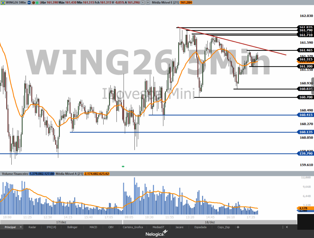O WING26 fechou em alta de 0,61% aos 161.315 pontos, no entanto, opera abaixo de uma LTB (Linha de Tendência de Baixa) que funciona como resistência muito forte no patamar de 161.500 pontos. Os próximos suportes ficam em 161.200, 160.835 e 160.700 pontos.