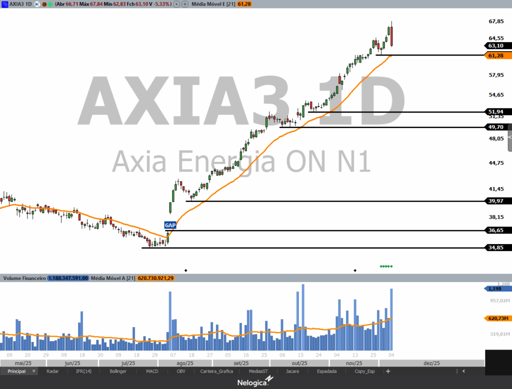 No pregão da última sexta-feira deixou uma máxima histórica em 67,84 iniciando uma correção que pode ocorrer até a MME21 (média móvel exponencial de 21 períodos) que fica em 61,28. Se romper essa média móvel pode buscar os fundos em 51,94 e 49,70.