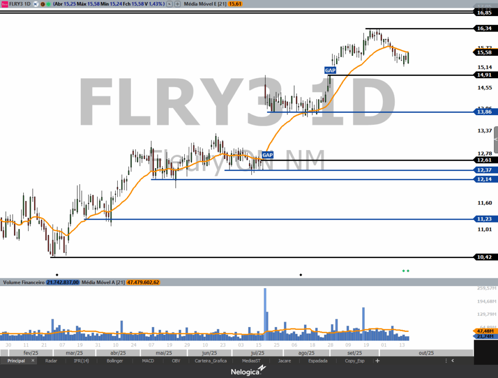 No médio prazo está em tendência de alta sendo que deixou uma resistência imediata em 16,34. Se romper essa barreira pode alcançar os topos deixados em dezembro de 2023 que ficam em 16,85 e 16,92. Já os próximos suportes ficam em 14,91 (GAP de alta aberto) e 13,86 (muito forte).