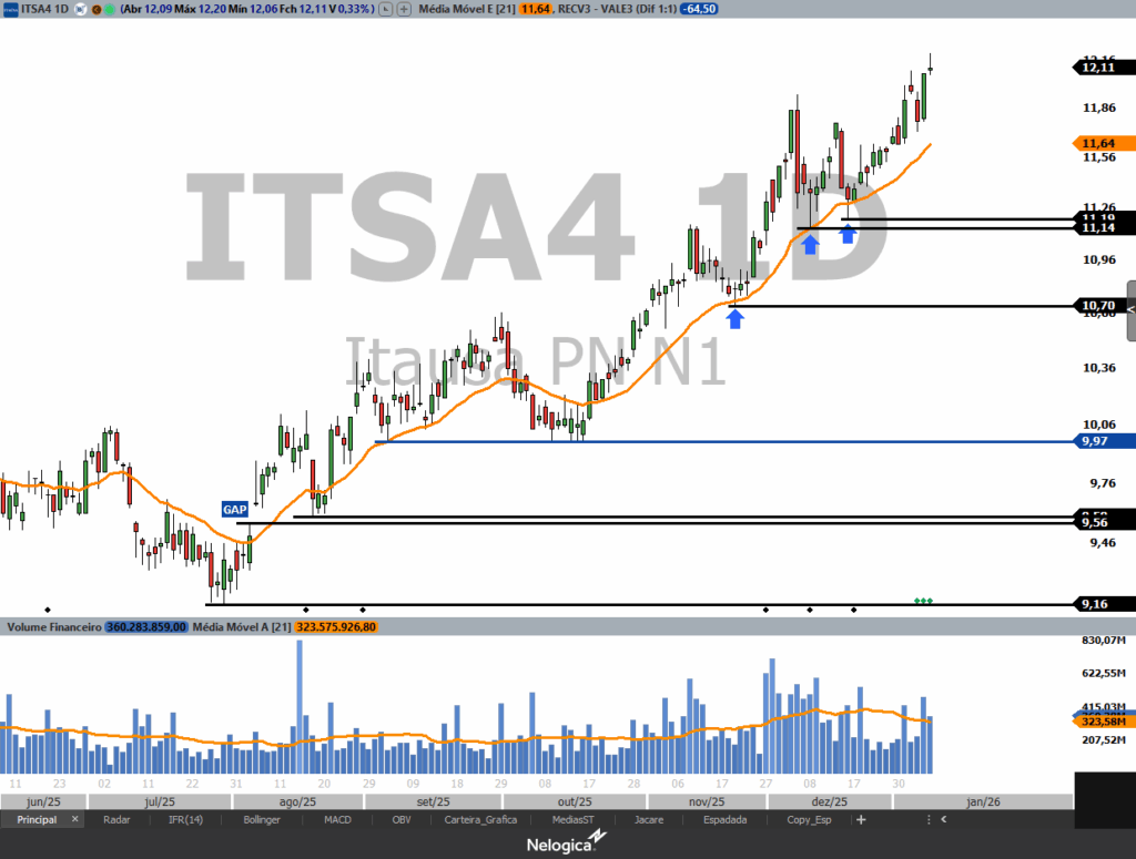 No gráfico diário o ativo continua respeitando a MME21 (média móvel exponencial de 21 períodos) que funciona como suporte imediato em 11,64. Enquanto permanecer acima dessa média a tendência de alta deve continuar. Vale lembrar que essa ação está na sua máxima histórica, portanto no momento não tem mais níveis de resistências para informar.