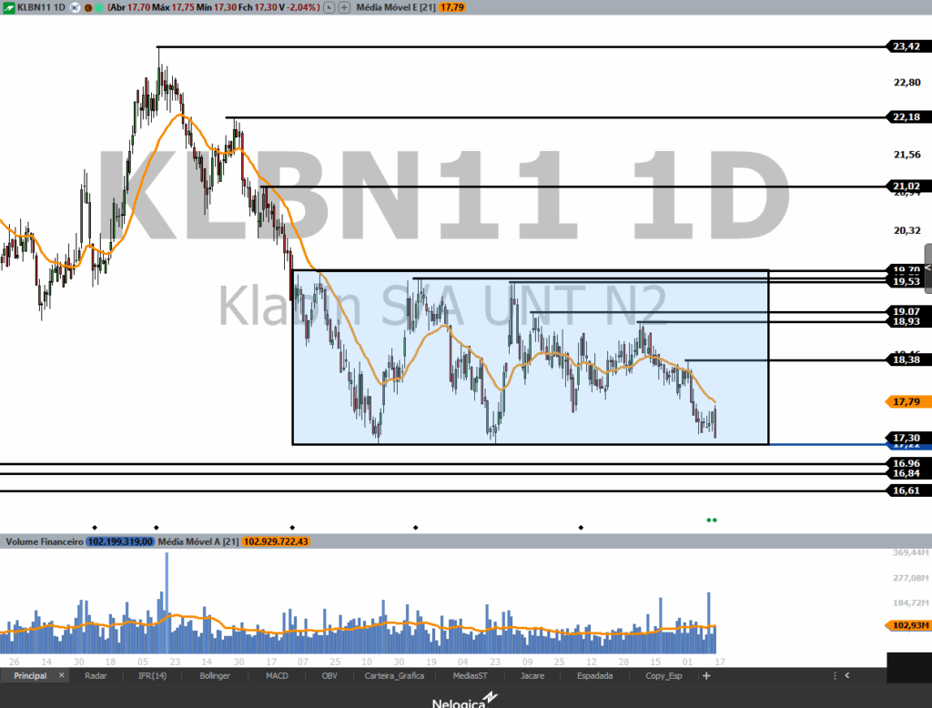 No curto e médio prazo está em tendência lateral (congestão) entre 17,22 (suporte muito forte) até 19,70 (resistência). Se testar e respeitar esse fundo em 17,22 pode abrir uma oportunidade de compra no Swing Trade com alvos nas próximas resistências que ficam em 18,38, 18,93 e 19,07.