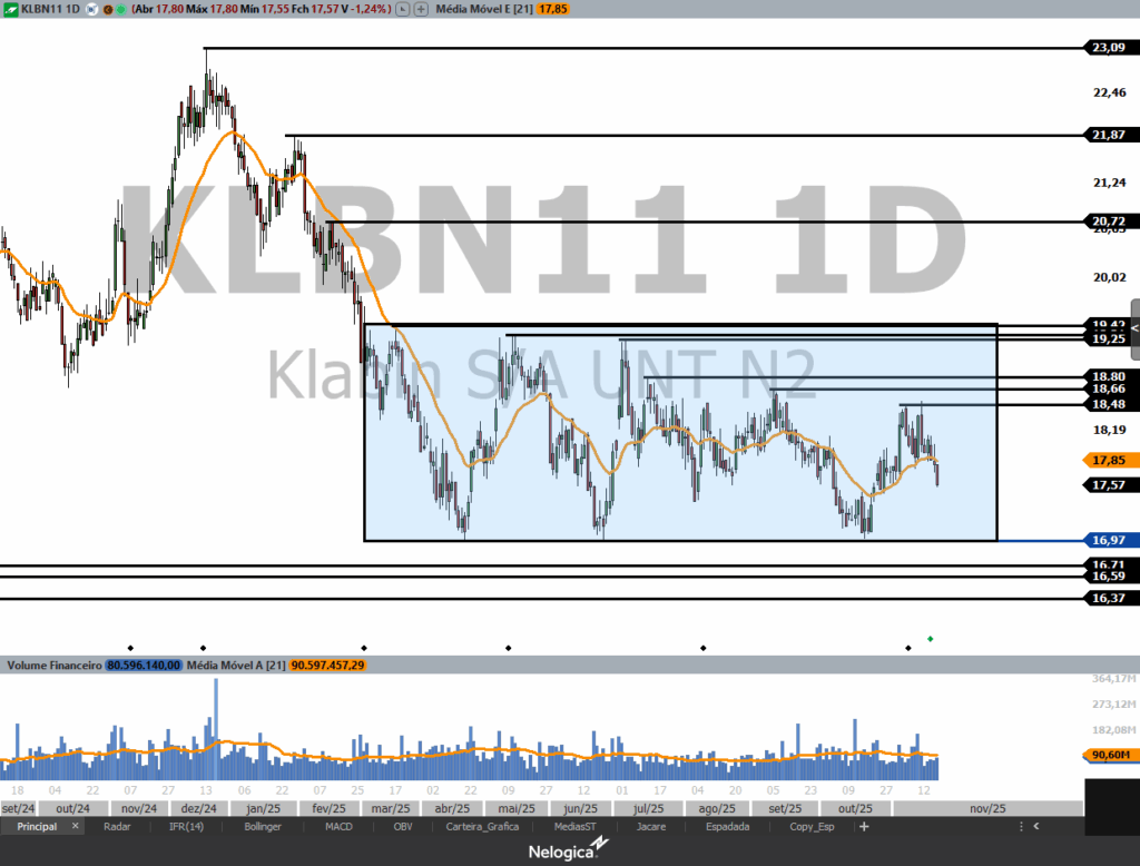 No curto e médio prazo está em tendência lateral (congestão) entre 16,97 (suporte muito forte) até 19,42 (resistência). Se testar e respeitar esse fundo em 16,97 pode abrir uma oportunidade de compra no Swing Trade com alvos nas próximas resistências que ficam em 18,48, 18,66 e 18,80.