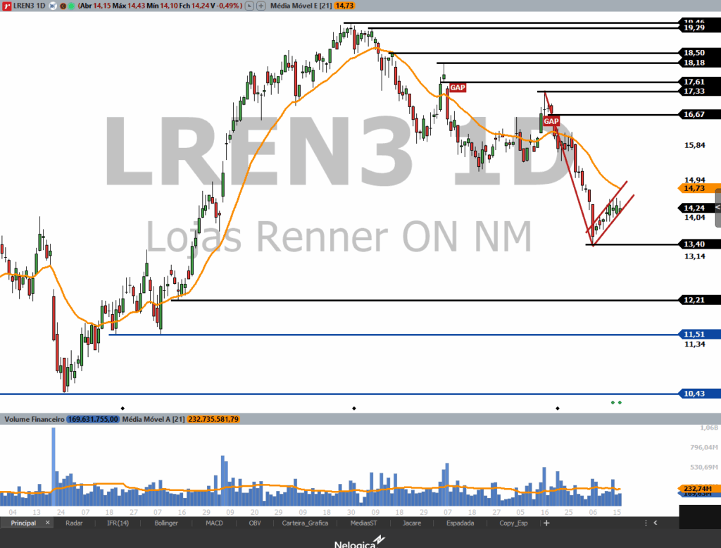 No curto e médio prazo está em tendência de baixa sendo que no gráfico diário entrou em formação de bandeira de baixa. Essa figura de continuidade de tendência foi traçada em vermelho na imagem abaixo e se fechar abaixo de 14,20 irá validar essa bandeira o que pode abrir uma oportunidade de venda no Swing Trade com alvos em 13,40 e 12,21 (próximos suportes). A resistência imediata fica na MME21 em 14,73.