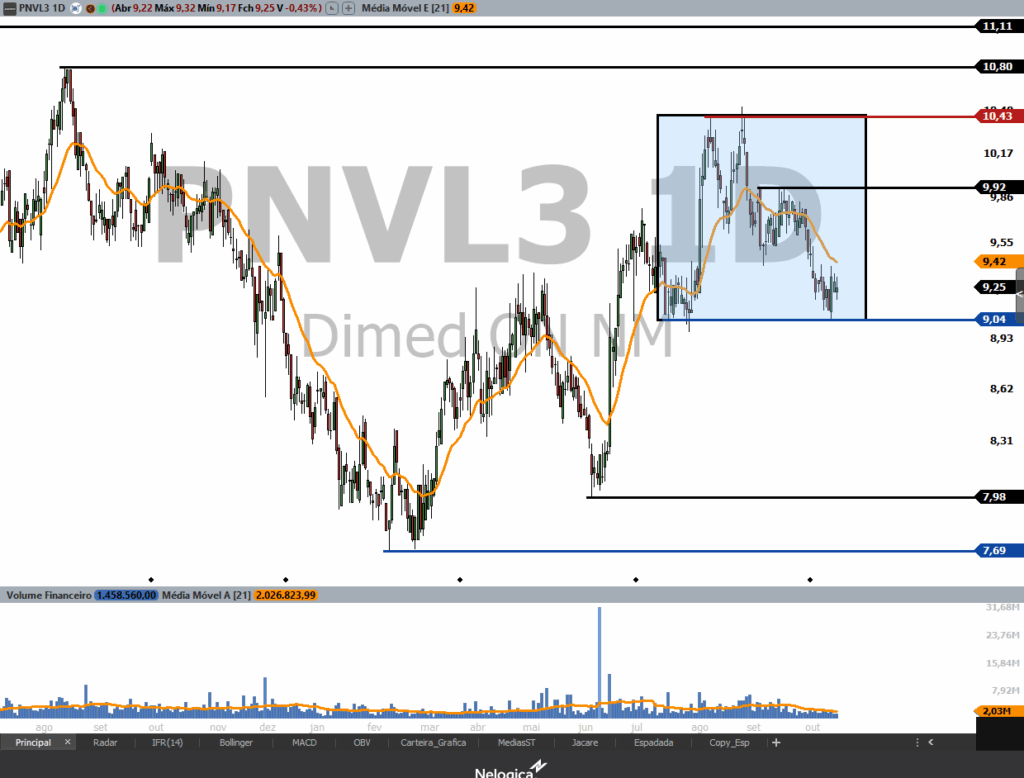 No médio prazo está em tendência lateral (congestão) entre 9,04 (suporte muito forte) até 10,43 (resistência muito forte). Se romper o suporte dessa congestão pode corrigir até 7,98 e 7,69 (próximos fundos).