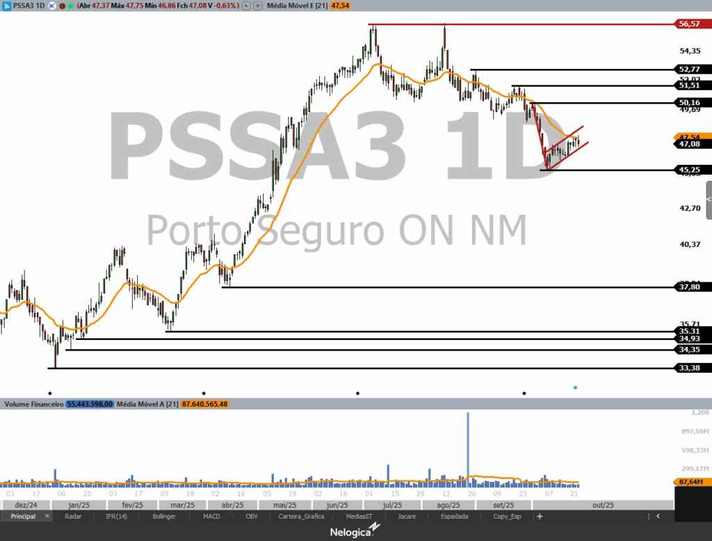 No curto e médio prazo está em tendência de baixa e entrou em formação de bandeira de baixa no gráfico diário. Se fechar abaixo de 46,80 pode validar essa bandeira e abrir uma oportunidade de venda no Swing Trade com alvo no suporte imediato que fica em 45,25. As próximas resistências ficam em 47,54 (MME21) e 50,16.