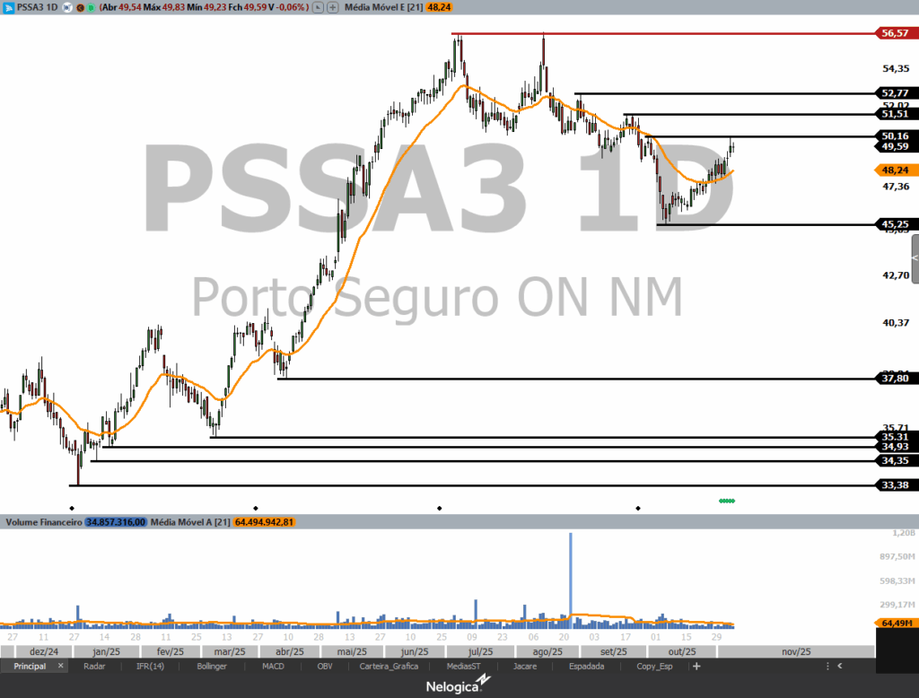 No gráfico diário o ativo estabilizou a queda em 45,25 (suporte imediato) iniciando um repique de alta dentro de uma tendência de baixa de curto e médio prazo. As próximas resistências ficam em 50,16, 51,51, 52,77 e 56,57 (muito forte).
