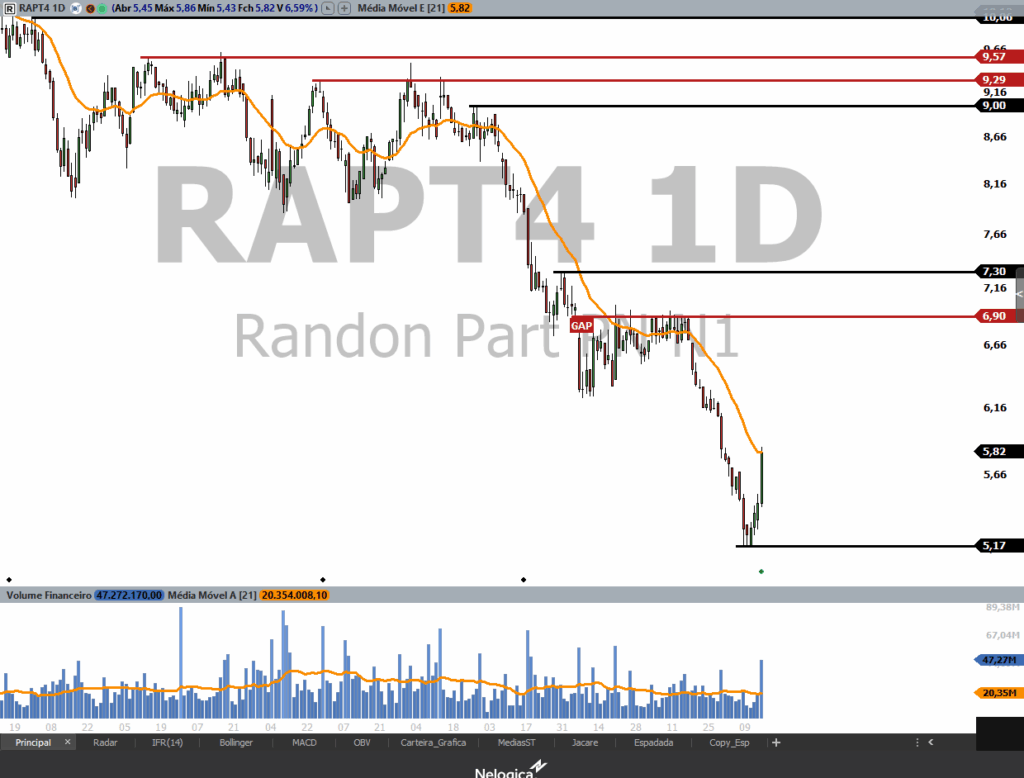 No gráfico o ativo estabilizou a queda em 5,17 (suporte imediato) iniciando um repique de alta até a MME21 (média móvel exponencial de 21 períodos) que funciona como resistência imediata em 5,82. Se superar essa MME21 pode abrir campo de alta até o patamar do GAP de baixa que fica em 6,90 e funciona como resistência muito forte.
