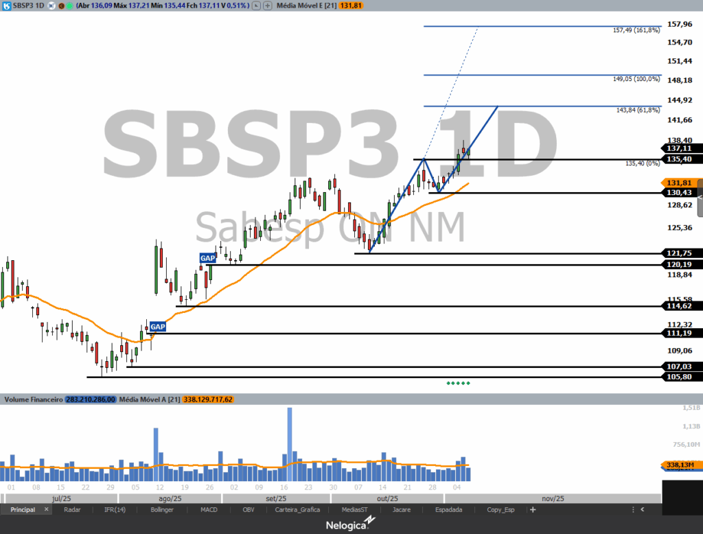 No pregão de 05/11/2025 o ativo rompeu a resistência em 135,40 validando um pivot de alta que foi traçado em azul no gráfico diário abaixo. Os próximos objetivos ficam nas projeções de 61,8%, 100% e 161,8% de Fibonacci em 143,84, 149,05 e 157,49 respectivamente.